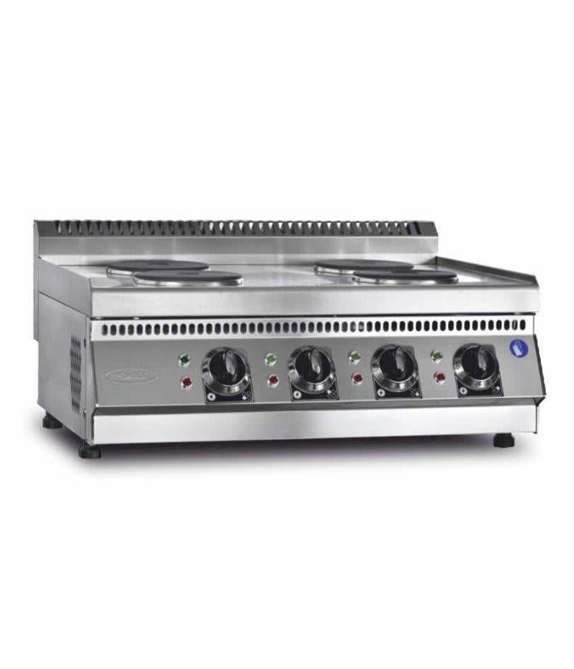 Pimak 70S-M182-4SE, endüstriyel mutfaklar için tasarlanmış, 4 gözlü elektrikli bir set üstü ocak modelidir. İki kademeli ısıtıcı pleytler ve yuvarlak veya kare ısıtıcı pleyt seçenekleri ile esnek kullanım imkânı sağlar. Paslanmaz çelik gövdesi ile uzun ömürlü ve hijyenik bir kullanım sunar.