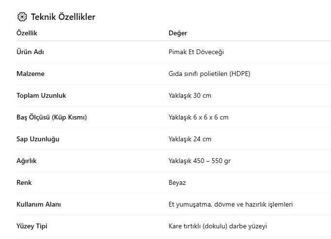 Pimak Et Döveceği, dayanıklı polietilen gövdesi sayesinde uzun ömürlü ve hijyeniktir. Etlerin dokusunu bozmadan yumuşatır, pişirme kalitesini artırır. Ergonomik sap tasarımı ile rahat kavrama ve kolay kullanım sağlar. Profesyonel mutfaklar, kasaplar ve restoranlar için idealdir.
